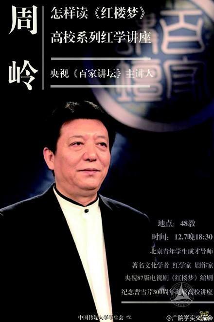 【S&P salon】周岭,著名红学家、中央电视台电视连续剧《红楼梦》编剧,每提到“红楼”二字,总会寻着红学研究的成就找到他的名字。一场红楼一场梦,对于名著《红楼梦》的品读从来都只在研究者一片诚心。 时间:12月7日(周一)18:30 地点:48教B403