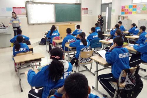 此次共建活动的分为授课和参观两个环节。首先,我校各强势专业发挥自身特色,为二外附中初一年级八个班级的学生上了一堂别开生面的思维启发课。课后,二外附中相关领导带领代表们参观了现有的基础设施,并介绍了该中学未来几年的发展目标。在授课环节,学院志愿者以英语和传媒为切入点,向初中学生们介绍了外国节日与动画电影的相关知识,以及实用的英语学习方法和网站。欧梨成为二外附中初一(5)班的学生们介绍了“圣诞节”的起源,并通过对节日卡片、节日用品、节日祝福语、节日主题曲等方面的介绍,激发了学生们的了解国外节日、学习外国文化的兴趣。“每年我跟家人都会一起过圣诞节,老师讲了之后,我才知道背后有这么多有意思的事儿。”初一(5)班的英语课代表在课后说。