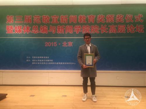 “范敬宜新闻教育奖”是以清华大学新闻与传播学院范敬宜院长命名的奖项,也是我国第一个“新闻教育类”奖项,分设“新闻学子奖”、“新闻教育良师奖”和“新闻教育良友奖”,分别颁发给优秀新闻专业学子、优秀新闻教师和优秀新闻从业者。卢烨同学本科就读于新闻传播学部电视学院2009级摄影(电视摄影)专业,2014年进入国际新闻传播硕士班,在第三届“范敬宜新闻教育奖”中荣获“新闻学子奖”,成为我校新闻传播学部第二位获得该新闻奖的学生。日前,记者对他进行了采访。