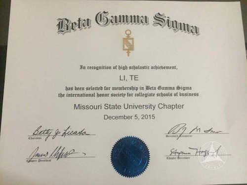 李特同学,在密大学习期间各门成绩全A,是密大商学院TOP 10 的学生,荣获2015年度“世界商学院组织”荣誉奖章,成为该组织的终身会员。会员身份是世界各地AACSB认证的著名商学院本科生和研究生所获得的商务和管理领域的最高荣誉,也是李特同学商务和管理领域职业发展的一种象征和殊荣,未来可以与全球商务精英一同参与该组织在全球的系列活动。