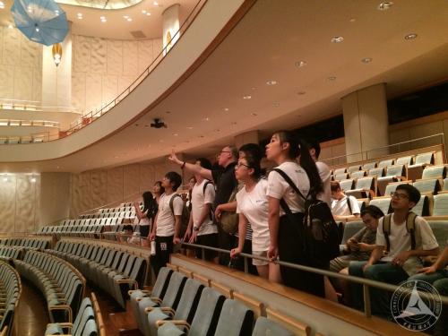 国家大剧院影视节目制作部孙洋先生向学生们介绍音乐厅顶部龟形反声板