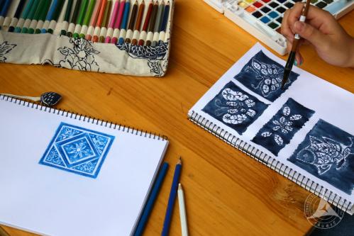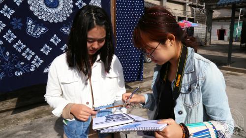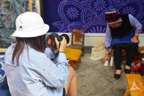 经过继续走访,实践团的同学们发现当地有几家有历史色彩的民间工坊。带着画笔和相机,大家踏入当地的民间扎染工坊,记录下那些传统的扎染花纹。这些质朴纯洁的白族村民接待了同学们,为同学们详细介绍了这项传统工艺。这项工艺是以缝为主,缝扎结合的手工扎花方法。之后经过反复浸染之后就有了这些古朴雅致的花纹。听完介绍的同学拿起手中的画笔,绘画出了这些素雅但又变幻玄妙的花纹;提起手里的相机,记录下了这一有繁有简的过程。