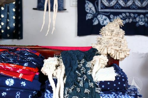 周城村,这个被誉为“白族扎染之乡”的白族村镇,保留着白族的各种传统习俗的同时,又与当代社会完美融合,设施完整。实践团队进入到当地的一家餐馆后惊喜的发现,这家餐馆的桌布,坐垫以及窗帘用的都是扎染布。这些扎染布的花形、纹样大都由规则的几何纹样组成,布局严谨饱满,极具艺术气息。同学们被大理古老扎染这一项独特的民间传统染色工艺的花形纹样所吸引。