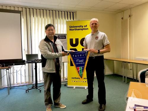 第二站是位于北安普顿的英国北安普顿大学,两位教授分别介绍了英国体育发展、DCMS(英国文化、媒体与体育部)及其下属机构在发展精英体育与大众体育中的作用、体育与国家形象以及北安普顿足球俱乐部的相关情况,任金州教授代表中传FIBA班向两位老师分别赠送了班旗。