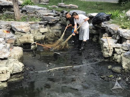 由于近期我市多有降雨,为将清淤工作进行的彻底不留遗漏,安全中心职工利用休息时间,头顶烈日加班加点的对水池进行放水、除污、冲洗以及修缮,数日间共清理淤泥杂物300余袋,冲洗面积达4510平米,修缮喷泉池周边管线设备十余处。