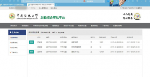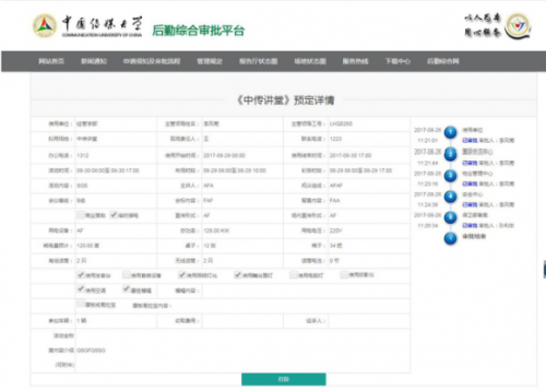 该系统按原线下实际审批流程设计,集校内公共报告厅、校园活动场地、办公电话安装、空调安装、新闻采访及公寓进出等业务的线上申请、审批、部门流转、审批进度查询、结果反馈及业务管理功能与一体。