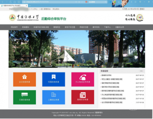 近年来,后勤管理处致力于后勤信息化建设,后勤网上审批系统是继网上报修、公寓管理、新生在线自助选房等系统后的又一重要举措。后勤管理处不断利用信息化手段,简化工作流程,提高工作效率和服务质量,努力实现真正意义上的“以人为本,用心服务”的服务宗旨。