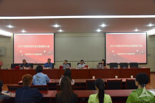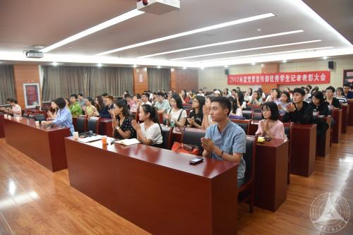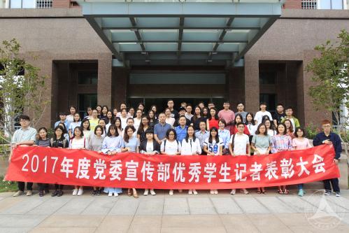 大会由裴鸣副部长主持。会议经一段轻松温馨的校级媒体宣传短片引入,王维家副主任宣读了关于表彰2017年度优秀学生记者的决定,陈杨园、张清霞等数十名优秀学生记者获得表彰。紧接着,在一阵阵热烈的掌声和欢快的乐曲声中,优秀记者依次上台领奖并合影。