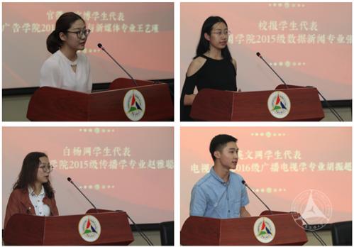 在学生记者代表发言环节,中国传媒大学官微官博的王艺瑾、中国传媒大学校报的张清霞、白杨网的赵雅聪和英文网的胡振超四位同学作为各自媒体组织的优秀记者代表,依次上台发言,阐发感受,回忆在校媒奋斗的过往,感慨自己与校媒的共同成长。其他获奖同学也纷纷表示在校媒的工作中获得了不可替代的媒体实践经验,找寻到了自己的价值,这个奖项也更应该属于一起为学校舆论建设付出努力的整个团队。
