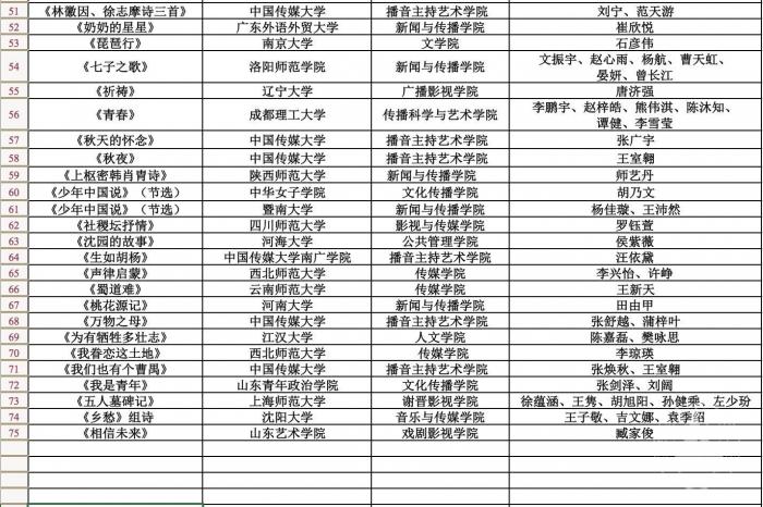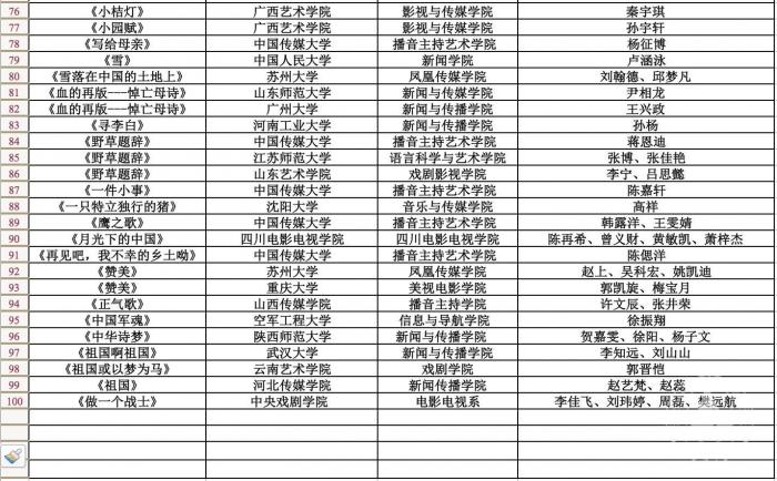 由中华人民共和国教育部、国家语言文字工作委员会主管,教育部语言文字应用管理司、中国传媒大学主办,中国传媒大学播音主持艺术学院承办的第19届齐越朗诵艺术节暨全国大学生朗诵大会——“中华经典诵读2017”初选工作已经全部结束,按照评审规则,经过专家严格评审,共有一百部作品入围全国复选,作品名单如下:
