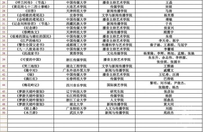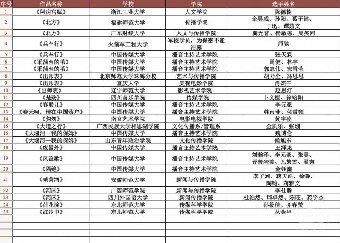 由中华人民共和国教育部、国家语言文字工作委员会主管,教育部语言文字应用管理司、中国传媒大学主办,中国传媒大学播音主持艺术学院承办的第19届齐越朗诵艺术节暨全国大学生朗诵大会——“中华经典诵读2017”初选工作已经全部结束,按照评审规则,经过专家严格评审,共有一百部作品入围全国复选,作品名单如下: