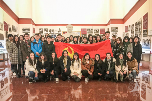 在毛主席生平纪念室,一篇篇历史文献原件反映着以毛泽东为主要代表的中国共产党人,如何努力推进马克思主义中国化,在革命和建设的实践中形成了具有鲜明中国特点的科学指导思想——毛泽东思想的历史过程。一幅幅真实的历史图片,勾勒出老一辈革命家探索中国革命和建设道路的艰辛历程和光辉业绩。一件件珍贵的历史文物,折射出老一辈革命家深入实际、深入群众,全心全意为人民服务的崇高风范。当看到一身补了又补、已经开线的秋衣秋裤时,所有同学都被革命领袖的崇高品质和高尚党性所打动;当看到被主席一次次修改的《关于处理人民内部矛盾的问题》手稿时,同学们感受到了一位伟大的革命领袖对于人民和国家的热爱;当看到毛主席“没有调查就没有发言权”的真迹时,同学们充分认识到了党对媒体工作者的严格要求和殷切期盼。参观的党员同志一行在这里举起党旗,重温了入党誓词,并在毛主席塑像前合影留念。