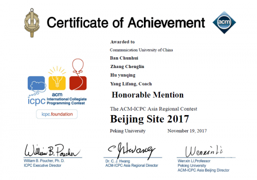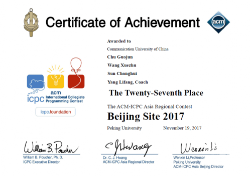 (通讯员 杨丽芳 李晨)2017年11月19日,我校代表队在第42届ACM国际大学生程序设计竞赛(ACM International Collegiate Programming Contest,简称ACM-ICPC或ICPC)北京站取得1个银奖1个优胜奖。这是我校在ACM-ICPC亚洲区域赛中获得的第1块银牌,并且凭借本次比赛的优异成绩,还获得了我校ACM比赛的第1个排位证书(只有学校成绩在前30名的学校才能获得排位证书,我校排位第27名)。