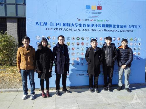 我校于2017年9月23日参与了第42届ICPC亚洲区域赛(北京)的网络赛选拔,经过1600多队的激烈pk,我校获得了1个现场赛名额,申请获批增加1个现场赛名额。现场赛于2017年11月18日-19日在北京大学体育馆举行。本次现场赛吸引了来自香港大学、清华大学、北京大学、上海交通大学、浙江大学、蒙古科技大学等134所高校的195支队伍参赛。