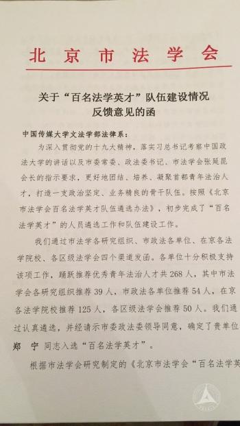 (通讯员 郑宁)12月11日,北京市法学会来函确认我校文法学部法律系郑宁副教授入选“百名法学英才”队伍建设计划。