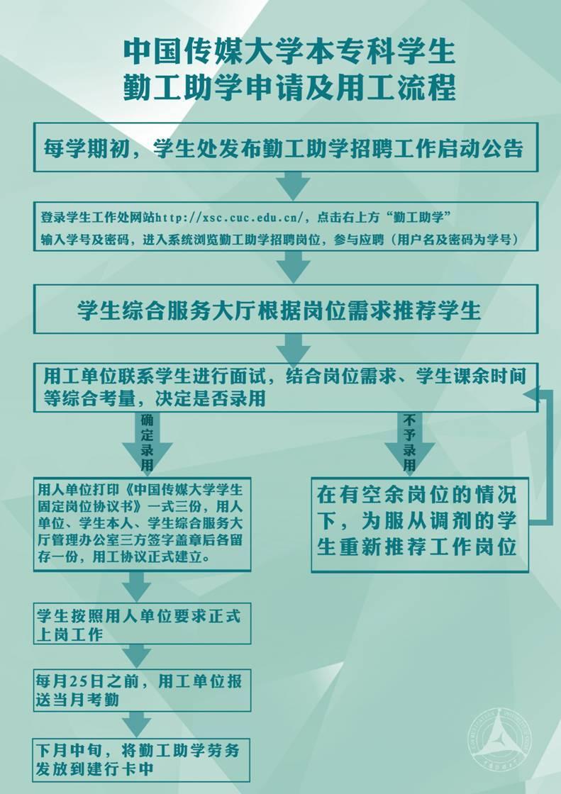 3. 勤工助学岗位管理、酬金标准、纪律和奖励等按照《中国传媒大学勤工助学管理办法(修订)》(中传学字【2016】138号)执行,管理规定见《学生手册》。