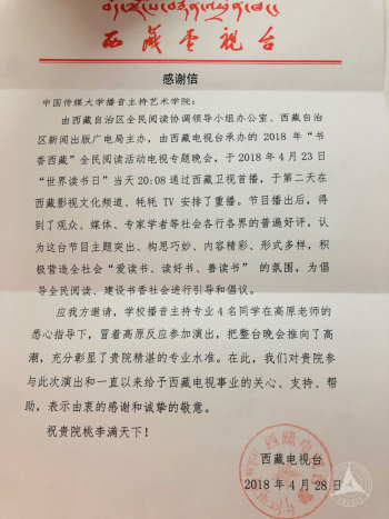 (通讯员 贺敬杰)4月19日至22日,播音主持艺术学院师生一行5人受西藏电视台邀请,前往拉萨参加以世界读书日为主题的《书香西藏》节目录制。录制当天,现场气氛热烈,受到了观众的好评。节目播出后,西藏电视台发来感谢信,对同学们在高原反应下仍呈现出精湛专业水准表示赞扬。