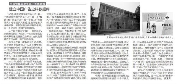 ( 通讯员 黄爱武)5月18日是第41届“国际博物馆日”。 我校广告博物馆作为代表之一接受了北京晚报的采访,并专题见报于北京晚报第34版专栏“大学里的博物馆”。