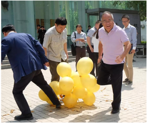 展览开幕式的策划也将展览主题进行了体验式的创意设计,开幕场景设计原计划制作做一个5米高的由黑白气球组成的蘑菇云,但因为时间和安全等问题搁浅,最终制作了8个由伞架做支撑的小蘑菇云,安插在广告博物馆前凸起的三角形草地上。同学们在气球上写下了对未来的期望,在一片欢笑中老师和同学将气球踩爆作为展览的揭幕。