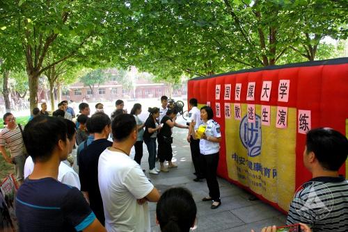 演练当日天气炎热,活动在树冠蔽日的梧桐大道上举行。现场设置一个占地24平方米、高2米的充气帐篷,里面布满烟雾,模拟真实火灾场景。参加演练的师生在消防教官简单培训之后,分组进入“火灾现场”,一手用湿毛巾捂住口鼻,一手摸索右侧“墙壁”沿昏暗曲折的弯道有序前行,最后从安全出口撤离到帐篷外。