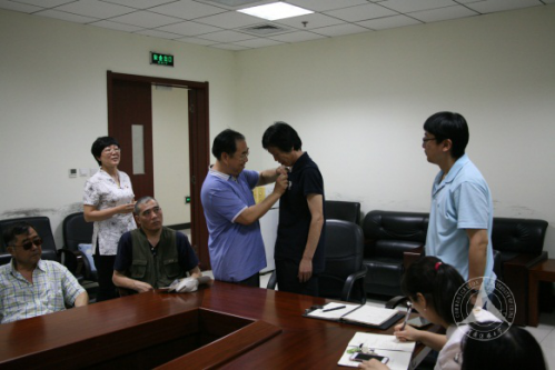 重温入党誓词活动结束后,图书馆副馆长章振兰老师代表全体党员为两位新党员同志献上寄语,鼓励两位同志勇于承担工作责任,在新时代新背景下,以更高标准要求自己,不忘初心,不辱使命;图书馆副馆长卢晋老师为两位新同志佩戴党徽。
