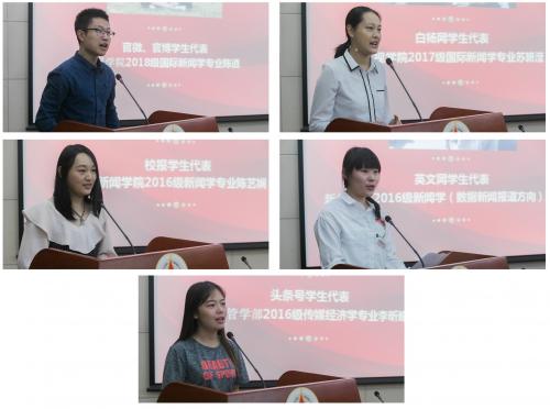官微、官博学生代表,2018级国际新闻学专业的陈逍发言中提出,提升党性、专业性、积极性是每一位校园媒体工作者应该对自己提出的要求。白杨网学生代表,2017级国际新闻学专业的苏碧滢讲述了自己从一名萌新成长为专业校媒记者的经历,言语中满怀对传媒行业的热情。校报学生代表,2016级新闻学专业的陈艺娴欣喜于自己能将专业课上学到的理论付诸实践,并期望自己能够保持新闻敏感、持续发现身边的大小事件。