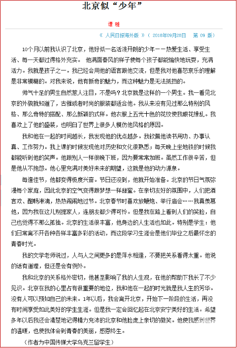 (通讯员 乐琦) 9月28日,《人民日报(海外版)》第九版转发我校汉语国际教育中心乌克兰留学生谭雅的中文文章《北京似“少年”》。全文用拟人的手法,把北京比喻为一位少年,以一名在北京学习与生活的留学生的角度,讲述作者对北京的理解。文章声情并茂,风趣幽默,用词准确,字里行间流露出留学在北京的收获与乐趣,体现出作者非常扎实的汉语基本功和中文写作能力。