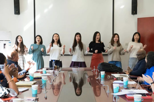 2015级斯瓦希里语专业学生为坦桑尼亚代表团献上斯语合唱表演。坦桑尼亚代表团和留学生们反应热烈。
