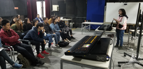 学习掌握MA调光台的操作是同学们此次系列活动的核心内容。此外,交流的内容还包括MA公司的发展历程以及未来灯光在技术方面的发展趋势。我校校友、现任职于安恒利公司的李怡燃同学担任此次培训活动的主讲人。她为同学们系统介绍了灯光网络的基本概念与形态,并演示了新款MA调光台的基本功能与操作界面。
