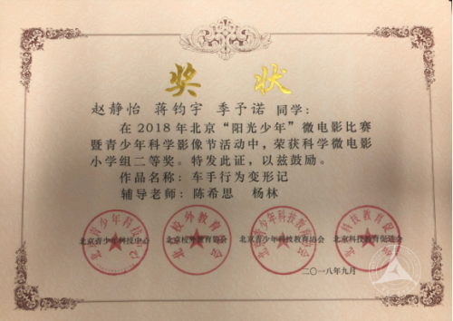 (通讯员 王晓丽)近日,中国传媒大学附属小学2013级与2014级学生共同制作的微电影作品《车手行为变形记》在第九届全国青少年科学影像节展映展评活动中,从全国三千多部作品中脱颖而出,荣获科学微电影的全国一等奖、专项奖和最佳表演奖。该作品根据中传附小科技节获奖作品“机动车驾驶员驾驶行为监管器”真实故事改编。此前,该作品还在2018年北京市“阳光少年”微电影比赛暨青少年科学影像节活动中,荣获科学微电影小学组二等奖。