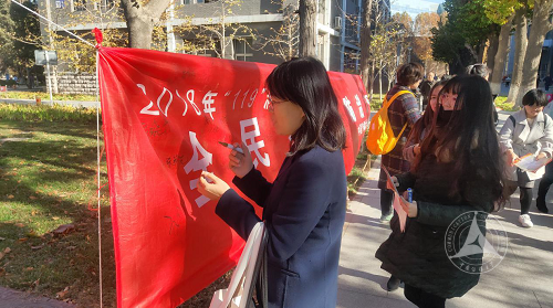 活动开始前,行动团负责人组织师生在活动主题横幅上签字。醒目的“全民参与 防止火灾”的横幅上布满密密麻麻的名字,代表着师生们对于防范火灾的庄重承诺。同时,行动团干事向师生发放了印有消防安全知识的传单,并就保护自我安全的知识与师生们进行了简单讨论。