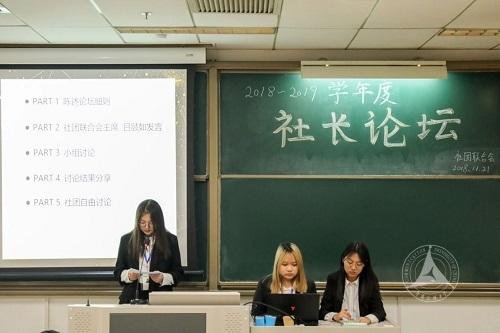 (通讯员 蒲禹江 张少奇 摄影 孙天歌)11月21日下午,由我校社团联合会主办的2018-2019学年秋季学期第四届“社长论坛”在博学楼A205正式召开。校团委书记郭婧娜、副书记武楠,社联主席团、社联组织部成员以及各社团代表参与了本次论坛。