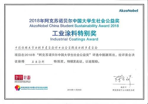 (通讯员 蒲禹江 郭成功美 张文静)11月20日,我校暑期社会实践团队“西村乡建实验博士社会实践团”的实验项目“西村乡建”在2018年“阿克苏诺贝尔中国大学生社会公益奖”中脱颖而出,获得工业涂料特别奖。此前,“西村乡建实验博士社会实践团”已获得了2017年中国传媒大学暑期社会实践一等奖和2017年首都大中专学生暑期社会实践优秀团队和先进个人奖。