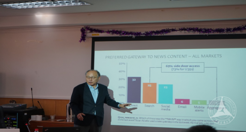 姜明求教授的讲座主要围绕新闻消费的变化及影响新闻信赖度的重要因素,数字时代传统媒体的生存问题和转型发展,以及韩国面临的新闻信赖度危机三个方面展开。他指出随着媒介的多元化发展,全球媒体消费新闻的渠道发生较大的变化。直接获取新闻占32%,通过搜索引擎占25%,社交媒体为23%,电子邮件6%,移动设备5%。其中,社交媒体消费新闻的人数上涨最为明显。姜明求教授对比分析各国新闻信赖情况,认为从全球来看公众对新闻媒体的信赖度普遍呈下降趋势,例如韩国有将近80%的居民对他们新闻报道的信赖度较低。比起新闻信赖度危机,更值得关注的是在数字化趋势下传统媒体的生存问题