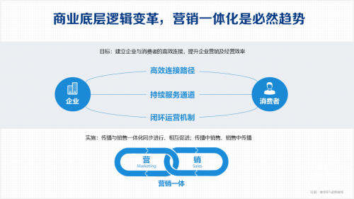 在传播和销售边界已经模糊的当下,营销分离的模式无法破题,必须打通两者界限、共同以用户为中心,构建新型的商家-用户连接关系,“营销一体”成为新趋势。
