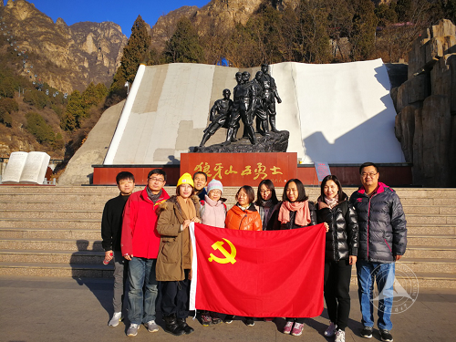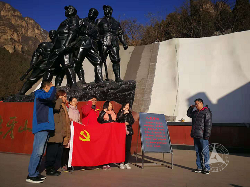到达河北易县狼牙山爱国主义教育基地后,在狼牙山五勇士雕像前,党支部全体党员举行“重温入党誓词”活动,全体党员展开鲜红的党旗,举起右拳,再次庄严宣誓。