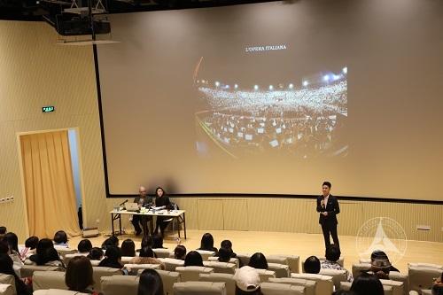 在专家讲座中,国家大剧院歌剧艺术顾问朱塞佩·库恰向同学们展示了多部世界闻名的歌剧作品,并介绍了歌剧的起源、发展历程,进行了中西艺术的比较。同时,他声情并茂地讲述了《阿依达》作者、歌剧大师威尔第的生平故事与创作经历,还原了当时的创作情景。在提问环节,大家发言踊跃,在轻松的氛围中了解到西方舞台表演艺术理论相关的知识,获益良多。
