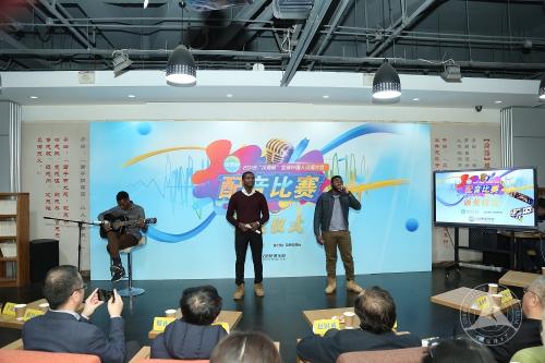 我校三名孔子学院奖学金生,来自尼日利亚的李睿和秦盛文、来自喀麦隆的贾思江,在颁奖仪式上表演了歌曲《飞得更高》。