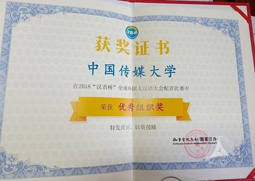 (通讯员 孙玉红)12月21日,国家汉办2018 “汉语桥”全球外国人汉语大会配音比赛颁奖仪式在汉办孔子学院总部隆重举行,为期数月的比赛落下帷幕。我校20名留学生报名参赛,两名参赛选手获得铜奖,我校也荣获“优秀组织奖”。