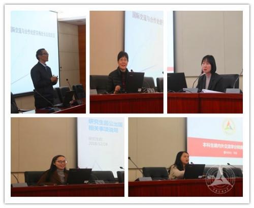 会上,国际交流与合作处(港澳台事务办公室)刘丰海副处长介绍了我校学生交流、交换项目概况,并重点围绕外事纪律要求、相关手续及行前准备等内容,有针对性地指导学生做好各项行前准备工作。学生工作部(处)李萍副处长从平安留学的角度,详细讲解了境外安全防范、使领馆保护、心理调适、知行礼仪等有关内容和注意事项,特别提出要具有保密意识和大局意识,言行得体,确保平安。研究生院培养办公室邓迪老师介绍了研究生出国(境)学习的校内相关政策、流程及应注意事项等,重点讲解了证件办理、学籍异动手续及学分转换管理办法。教务处学籍管理科李波老师讲解了本科生赴(国)境外高校交流学习的学籍及成绩认定管理办法,就其中学分转换等作了重点强调与解释。