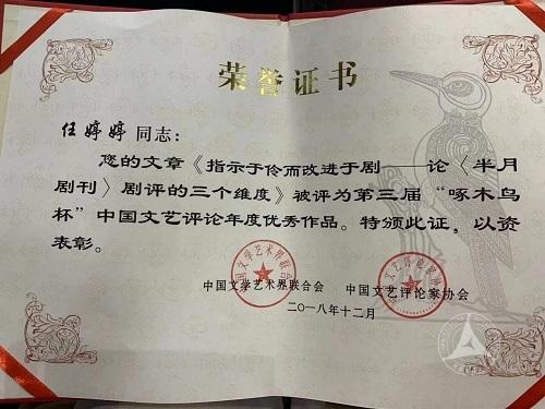 (通讯员 任婷婷)由中国文联、中国文艺评论家协会主办的第三届“啄木鸟杯”中国文艺评论2018年度推优活动发布大会近日在北京中国文联举行。中国文艺评论家协会主席仲呈祥,中国文艺评论家协会副主席夏潮,中国文联副主席、中国文艺评论家协会副主席陈振濂,中国文联主席团委员、中国文艺评论家协会副主席王一川等出席颁奖典礼,并为获奖者颁奖。我校戏剧影视学院博士生任婷婷的作品《指示于伶而改进于剧——论<半月剧刊>剧评的三个维度》被评为“啄木鸟杯”2018年度“中国文艺评论优秀作品”。