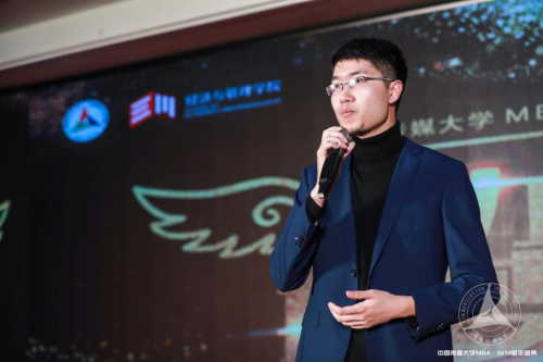 随后,第八届中国传媒大学MBA联合会主席胡靖明同学代表中传MBA联合会以及全体MBA学生对来自各兄弟院校以及赞助商企业、媒体单位表示欢迎和感谢。他提到,中传MBA品牌离不开中传MBA师生多年来共同的努力,也离不开各兄弟院校以及广大社会人士的帮助。他衷心地祝愿在座各位2019年取得更多的成绩,作出更多的贡献,推动和支持中传MBA的进步与发展。