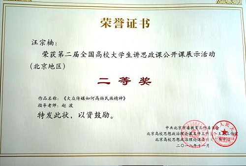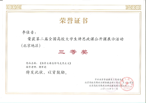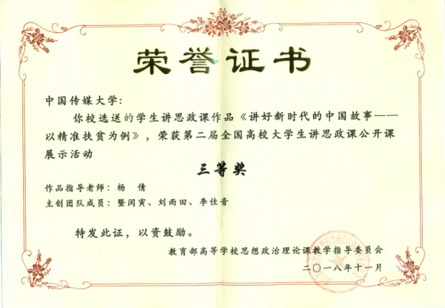 (通讯员 暨闰寅 汪棕南 杨倩 赵波 阴军莉)2018年12月,由马克思主义学院杨倩副教授指导,播音主持艺术学院本科16级暨闰寅、刘雨田、李佳音三位同学共同完成的作品《讲好新时代的中国故事——以精准扶贫为例》,荣获第二届全国高校大学生讲思政课公开赛展示活动三等奖。由马克思主义学院赵波副教授指导,2017级广播电视学(国际新闻传播方向)本科生汪宗楠同学和其团队薛力、王元廷完成的作品《大众传媒如何高扬民族精神》,荣获“昂首复兴路• 最美新时代”——第二届全国高校大学生讲思政课公开课展示活动中获得二等奖(北京地区)。由马克思主义学院阴军莉老师指导,播音主持艺术学院本科16级李佳音同学及其团队完成的作品《为什么要信仰马克思主义》,荣获在“昂首复兴路•最美新时代”——第二届全国高校大学生讲思政课公开课展示活动中获得三等奖(北京地区)。