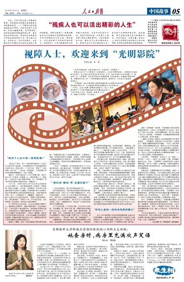 2019年05月23日,《人民日报海外版》以《视障人士,欢迎来到“光明影院”》为题对我校“光明影院”项目进行大版面专题报道。原文如下:
