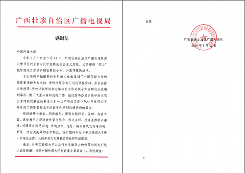 (通讯员 陈咪咪)近日,广西壮族自治区广播电视局发来感谢信,对我校积极承办“深入学习习近平新时代中国特色社会主义思想,切实增强‘四力’教育实践工作培训班”工作中,在课程设置、学习交流、后勤保障等方面提供的支持和服务表达感谢。