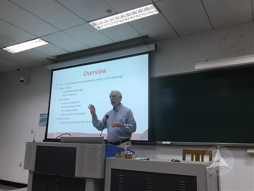 此次海外教授工作坊中,伍德沃德教授从宏观及微观两个层面对中美经济实力进行了详尽的对比分析,指出产业集群是推动生产力提高、经济增长的强大驱动力。伍德沃德教授的演讲主题契合学生的专业背景,数据翔实、图文并茂、深入浅出,受到了学生的一致好评,并引发了学生的积极思考。学生基于演讲内容用流利的英语就中国产业结构升级、贸易战等问题对伍德沃德教授进行了提问,通过轻松愉快的互动获得了对这些问题更深入的认识。在两个小时的工作坊结束之后,部分学生仍意犹未尽,留下来继续与伍德沃德教授进行了半个小时的小范围交流。