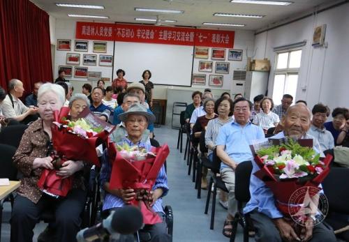 表彰会还为具有70年以上党龄的老党员献上鲜花。他们加入共产党的革命生涯与新中国的诞生、成长、繁荣紧密联系在一起,对共和国具有血浓于水的深情。藉此建党98周年之际,离退休人员党委向他们献上深深的敬意和诚挚的祝福。