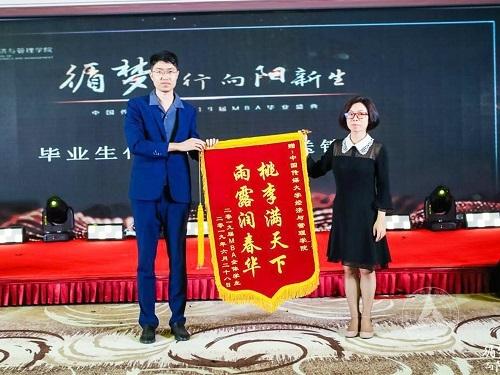 中国传媒大学工会常务副主席、MBA校友会名誉会长薛永斌教授作为教师代表进行发言,他祝贺各位同学顺利毕业,同时送大家一幅对联:上联是二载同窗,同学情师生情校友情情谊绵长;下联是一生受用,创业路求学路人生路路途坦荡;横批:一路情怀。