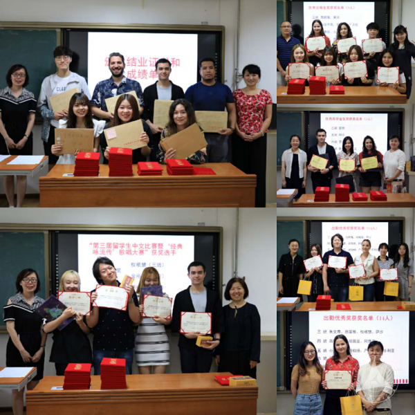肖莉老师宣布了获得结业证书学生名单,各班学生代表上台领取结业证书及成绩单。结业典礼上,汉语国际教育中心对各类优秀语言进修生进行了表彰。张婧与任课教师代表为获奖学生颁发了证书和精美的奖品,并与学生一起合影留念。