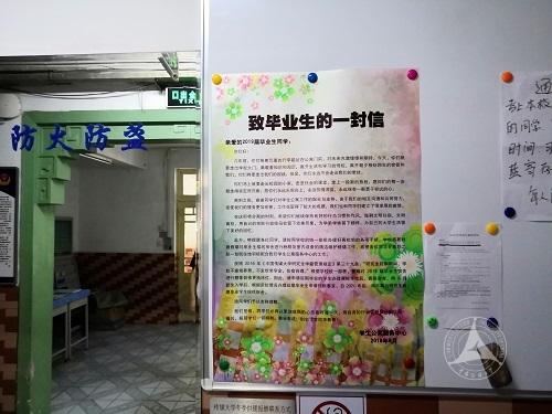 学生公寓是毕业生离校工作的主战场,毕业生人数多、办理手续相对集中,工作任务重。为确保毕业生安全、文明、有序离校,学生公寓服务中心在各公寓楼张贴《致毕业生的一封信》,倡议文明退宿,并通过微博、微信等多方平台宣传毕业生离校退宿流程。同时,宿管阿姨们在各公寓楼绘制黑板报,以质朴的语言表达对毕业生的期望与祝福,让同学们感受来自学校的关怀与期盼。